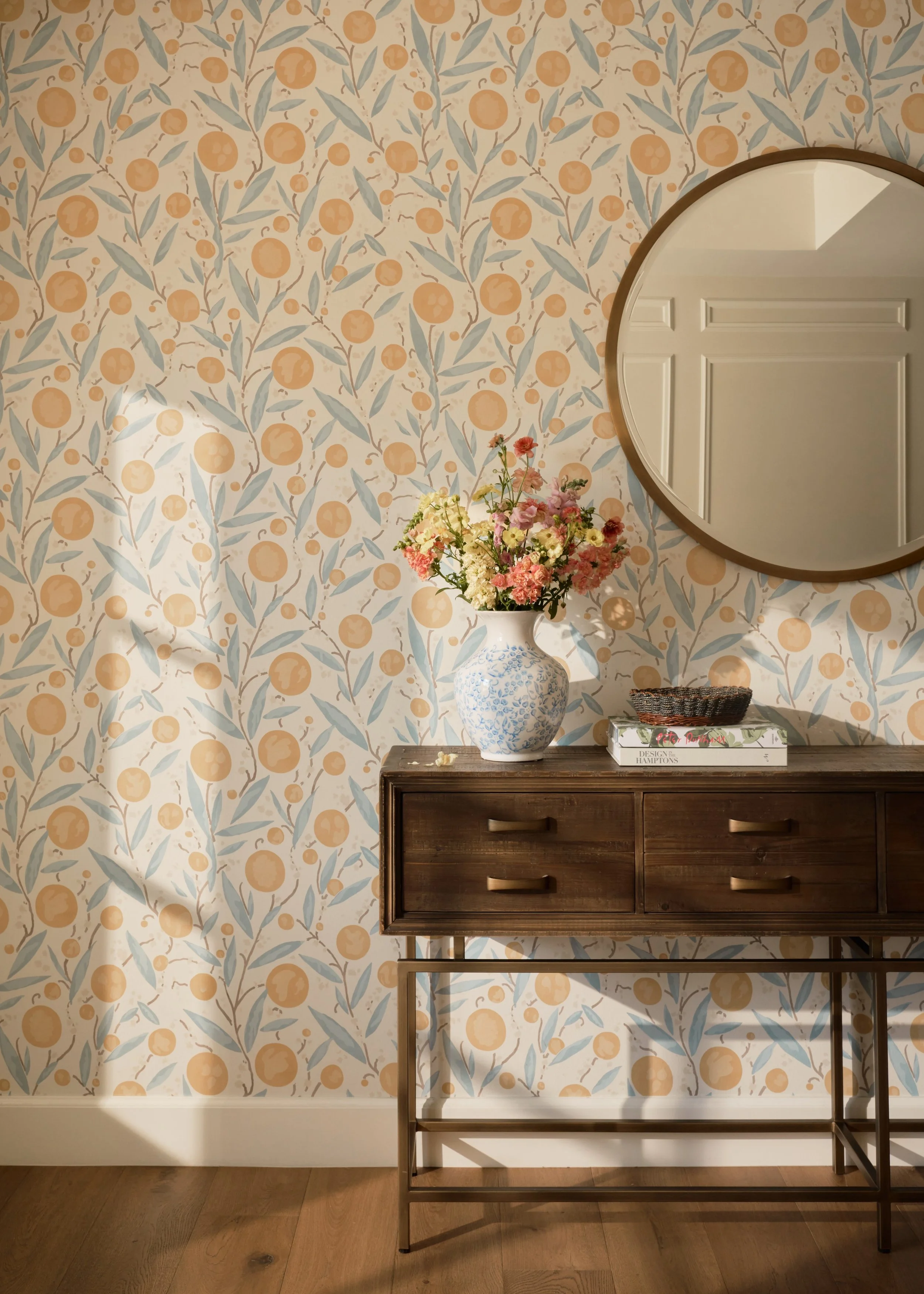 A light, bright beach house in the traditional vein with bold strokes of color, featuring a mix of new furnishings and beloved family heirlooms.